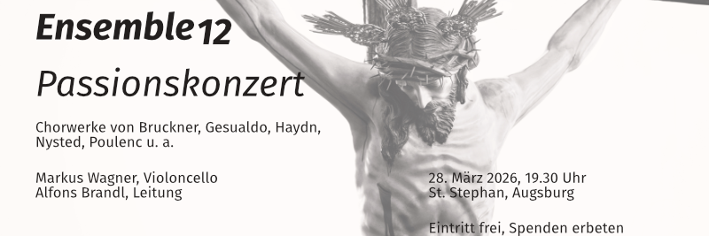 Das Ensemble12 konzertiert am Samstag, 28. März 2026 erneut in der vertrauten und hervorragenden Akustik von St. Stephan mit einem besonderen Programm zum Beginn der Karwoche. Das Zentrum der Werkreihenfolge bildet eine Kompilation aus den Passionsmotetten von Francis Poulenc mit den „Tenebrae“ von Carlo Gesualdo. Klassische Moderne trifft auf Musik der Hochrenaissance. Ein zweites Highlight im Programm ist die Aufführung des „Stabat mater“ für Solocello und Chor von Knut Nystedt. Die mittelalterliche Dichtung über den Schmerz der Gottesmutter wird vom Chor in schmerzvollen Dissonanzen aber auch tröstlichen Klängen illustriert. Das alles auf der Basis einer hochvirtuosen Solosonate für Violoncello, gespielt von Markus Wagner.